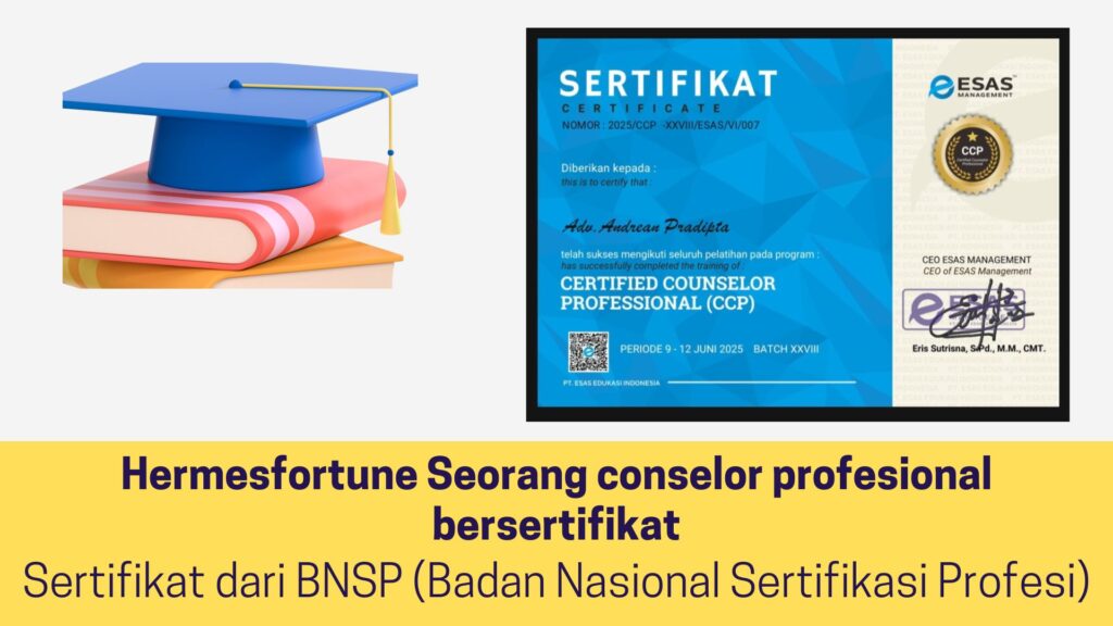 Hermesfortune yang bernama Asli Andre,sudah Lulus sertifikasi CCP daei Bnsp,oleh karena itu hermesfortube seorang conselor profesional bersetifikat