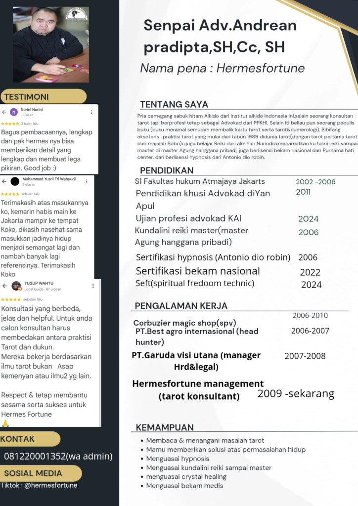 Untuk memberikan pelayanan terbaik bagi klien,selain ilmu tarot yang sudah digeluti sejak tahun 1989,Hermesfortune juga mengambil sertifikasi conselor untuk dapat memberikan solusi terbaik dan lebih memahami klien dari sudut oandang psikilogi. Hermesfortune lulus sertifikasi conselor dengan gelar Ccp(certified conselor profesional)